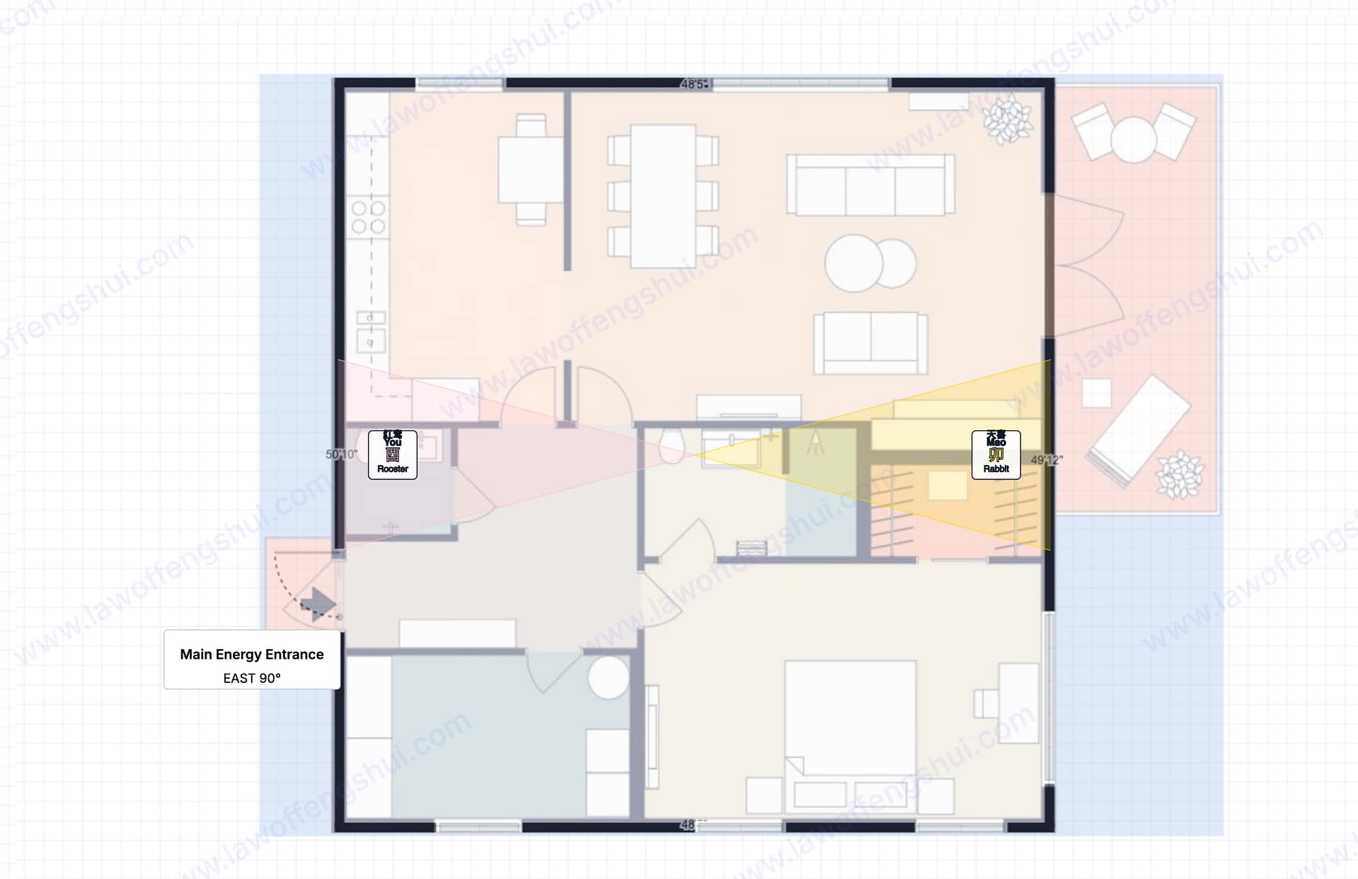 The bedroom (bottom-right, roughly SSE): Sits in a sector that holds neither the Hongluan nor the Tianxi star for 2026.